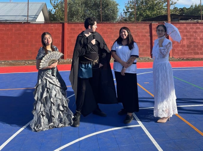 Una vez allí, Marcial Torres, estudiante de Tercero Medio Smetana y caracterizado como el juglar, explicó con presencia y maestría las razones de sus constantes viajes y lo que sus ojos habían visto en esos desplazamientos por el planeta. “¡Oh Dios!. Lo que estos ojos han visto no lo comprende la inteligencia humana y desafía la razón de los filósofos.(…) Mi viaje ha sido largo y cansador. Estos pobres huesos no conocen de la blandura de una cama ni de las caricias de una doncella. Es que la vida de un juglar es así. Su única compañía son el viento, el cielo estrellado y uno que otro caminante de pasar ligero que a veces me ofrece una historia y un sorbo de vino.” Todo esto mientras las doncellas, Martina Parra y Valentina Espinoza de Cuarto Medio Allegri, se abanicaban y acompañaban las palabras del juglar con miradas y gestos discretos.