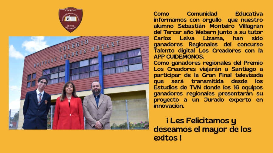El alumno Sebastián Monteiro Villagrán del 3° Medio Webern RESULTO GANADOR REGIONAL 2021 CON LA APP “CUIDEMONOS” DEL CONCURSO TALENTO DIGITAL DE LOS CREADORES LO QUE LE PERMITE PARTICIPAR DE LA GRAN FINAL EN SANTIAGO ,junto a su tutor el Ingeniero en Informática Carlos Pérez Lizama.