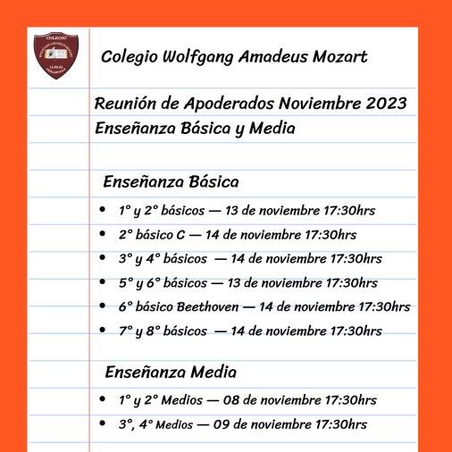 Estimados padres y apoderados: Informamos las fechas y horarios de reuniones de Enseñanza básica y Enseñanza media correspondientes al mes de noviembre.